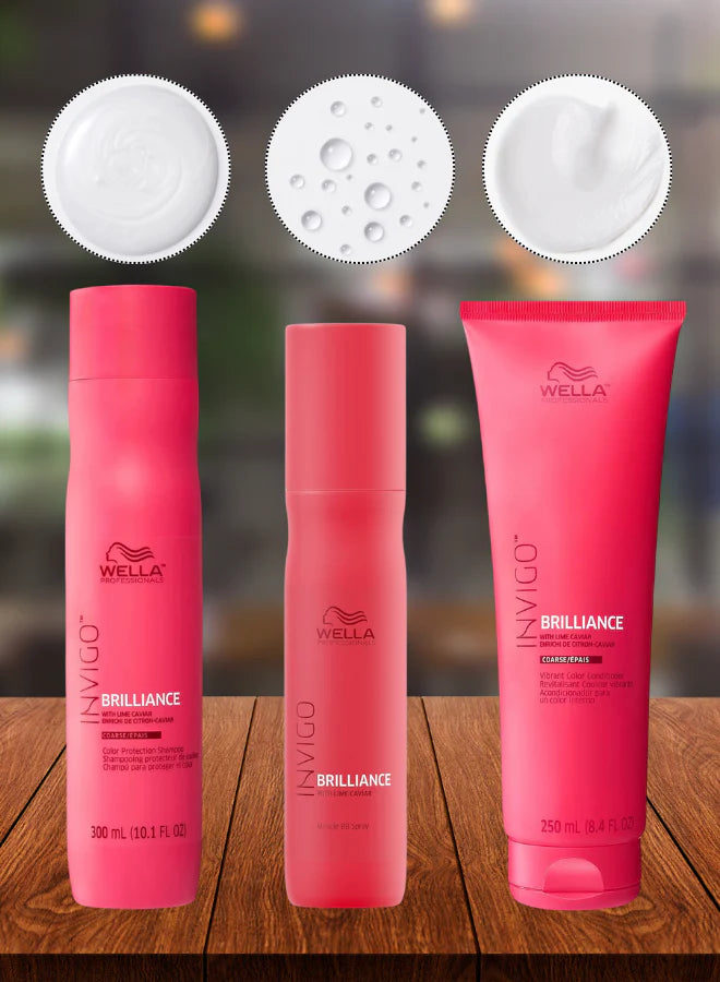 مجموعة ويلا بريليانس الثلاثية للشعر الخشن، مصممة خصيصاً لتعزيز جمال ولمعان الشعر الخشن المصبوغ. تتضمن هذه المجموعة الثلاثية الاحترافية شامبو وبلسماً وقناعاً علاجياً غنياً بعوامل تنظيف لطيفة ومكونات مغذية توفر ترطيباً مكثفاً دون إثقال الشعر. صُممت هذه المجموعة لحماية حيوية اللون مع ترويض الشعر الخشن، فهي تنعم الشعر الخشن وتعزز سهولة تسريحه للحصول على خصلات ناعمة ومشرقة. استعيدي لمعان شعركِ ونعومته مع عناية ويلا الاحترافية، المثالية للحفاظ على شعر صحي وحيوي كل يوم.